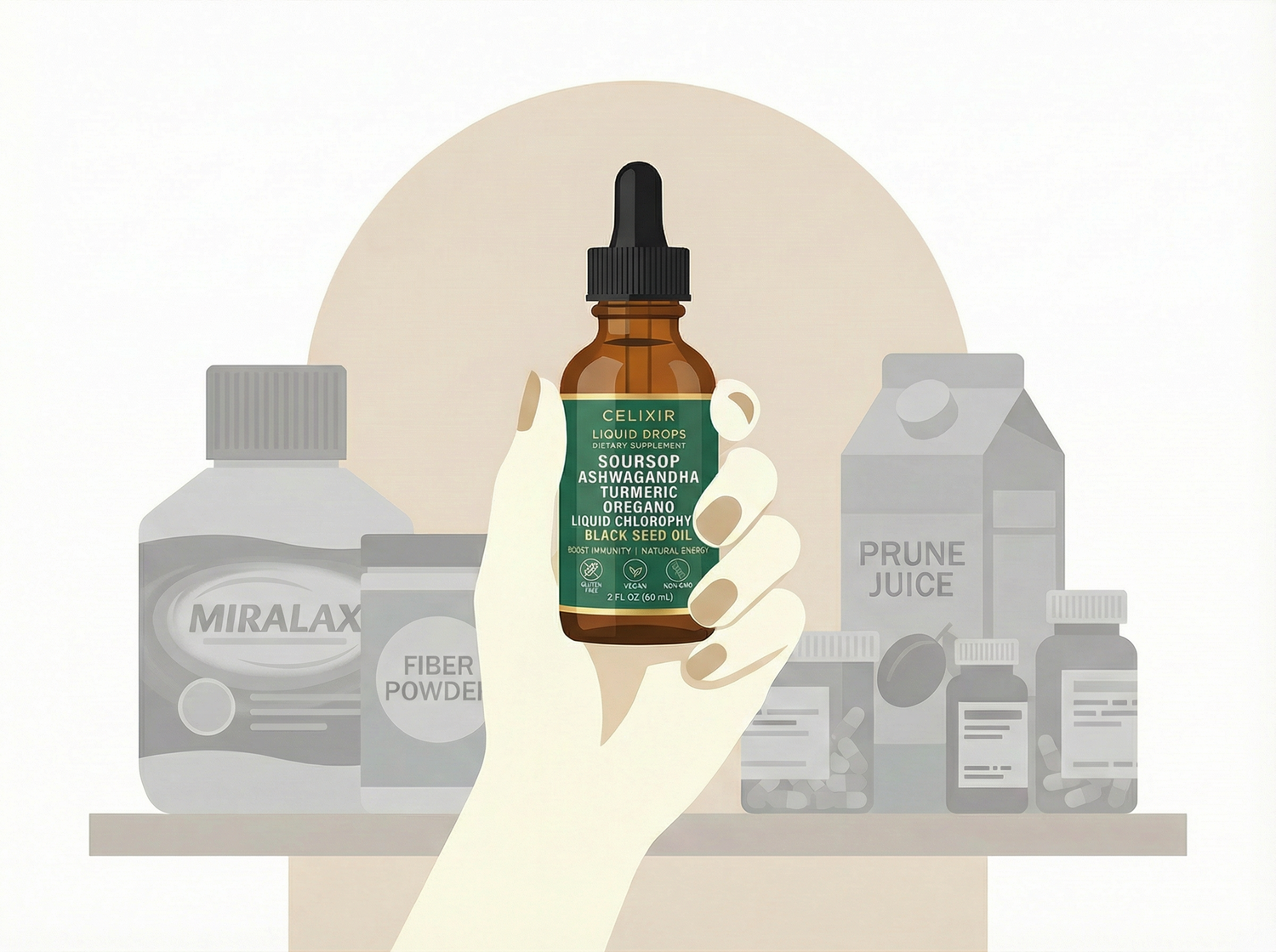Celixir combines 6 gut-supporting ingredients in one liquid dropper you take daily. No fiber bloat. No stimulant cramping. Just take it.